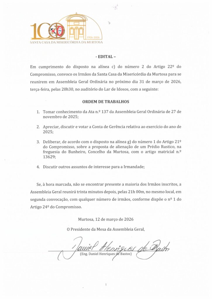 Em cumprimento do disposto na alínea b) do número 2 do Artigo 22º do Compromisso, convoco os Irmãos da Santa Casa da Misericórdia da Murtosa para se reunirem em Assembleia Geral Ordinária no próximo dia 31 de março de 2026, terça-feira, pelas 20h30, no auditório do Lar de Idosos, com a seguinte